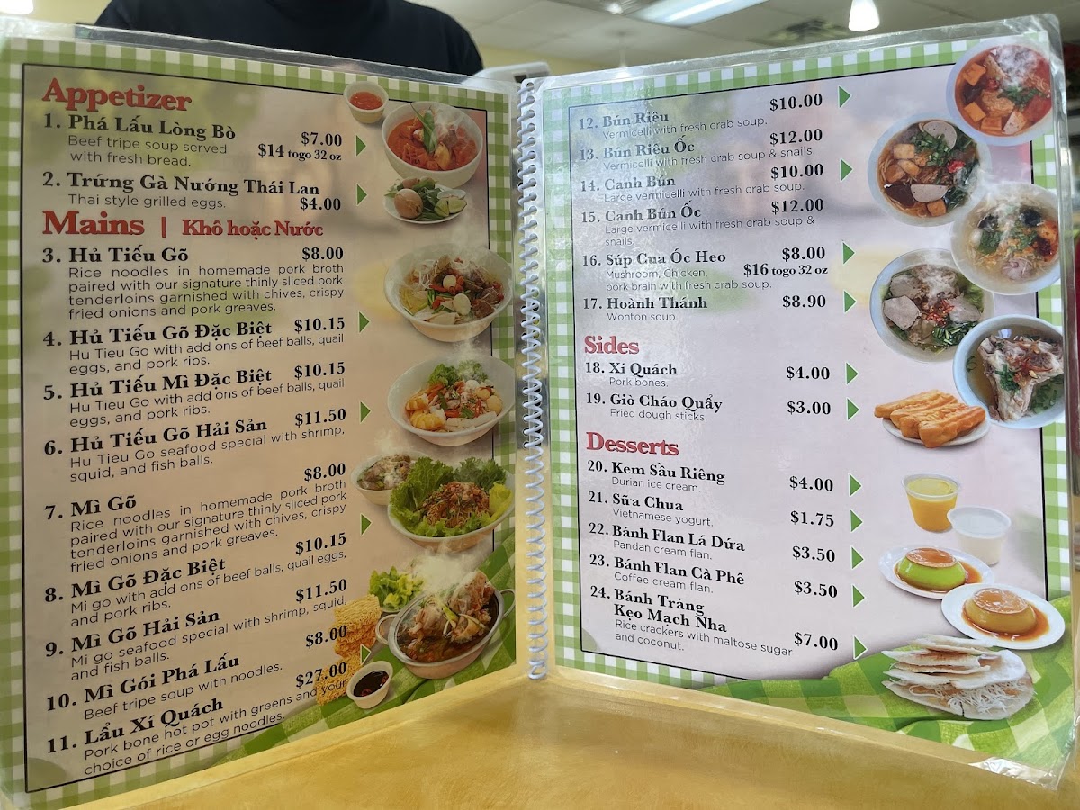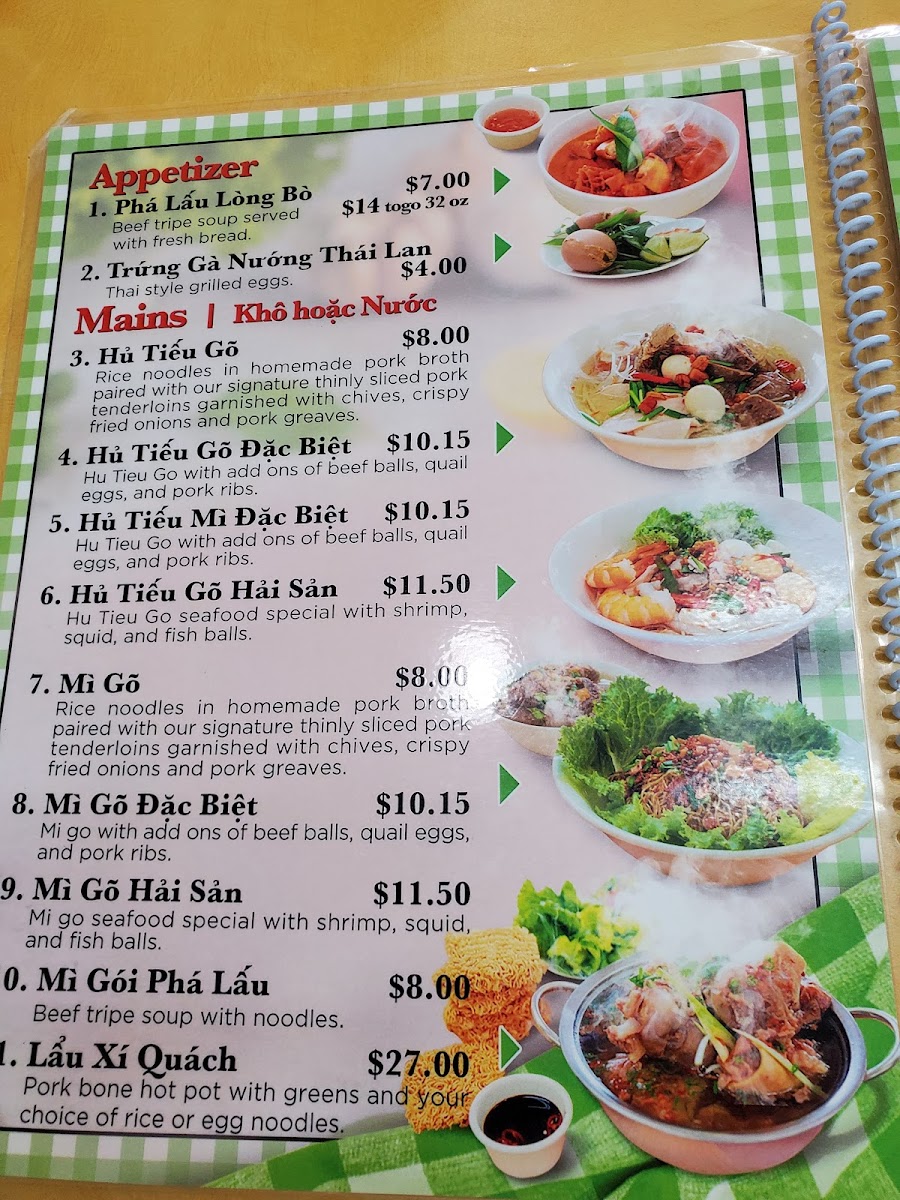 “ Great quality Vietnamese food at an incredible price. The restaurant is kind of hidden in a little strip of shops, but it is an amazing find. We felt like strangers in there among a mix of more elderly Vietnamese folks stopping in after work and groups of parents telling their kids to stop using their electronics in Vietnamese while they retorted in English -- very goods signs of authenticity. While the interior is nothing special and unassuming, the food is incredible and at such an inexpensive price! We ordered the Hu Tieu Go (pho with pork broth), Mi Go (like Hu Tieu Go but without broth), and Xi Quach (pork bones). The noodles in both dishes were cooked perfectly, and the clear pork broth had an incredibly aromatic, smooth, and delicate flavor. The thin slices of pork were also great, and the crispy garlic chips and green onions were great toppings that added crunch and extra flavor. As for the pork bones, the meat was falling off the bone, the connective tissue was practically gelatenized, and it was all packed with the fantastic pork broth flavor that it was used for. If you're feeling particularly decadent, dip the meat in a mix of soy sauce/vinegar/hoisin and the nice slices of chili (bird's eye chili?) they include at every table. Flavor town. The portion sizes are reasonable but smaller than most other Vietnamese restaurants, but I think the price, quality, and flavor more than make up for it. The food came out incredibly fast -- probably within 10 minutes of ordering. ”